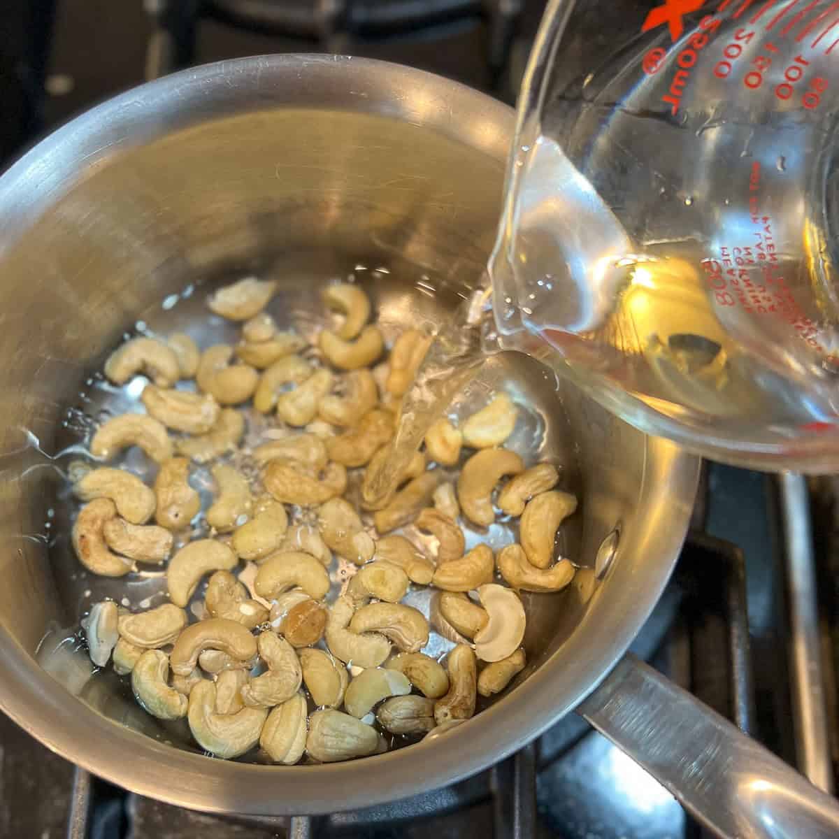 - Either soak cashews overnight in water to soften, or do a quick boil. Put cashews in a small pot with water and gently boil for about 3 to 4 minutes. Drain and set aside.
