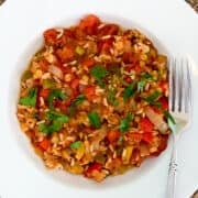 This One Pot Deconstructed Stuffed Peppers is a meal prep favorite. These unstuffed peppers are full of flavor and freezer friendly. Not only is it vegan, but it's also gluten-free, nut-free, soy-free, oil-free, high in protein and low in fat.